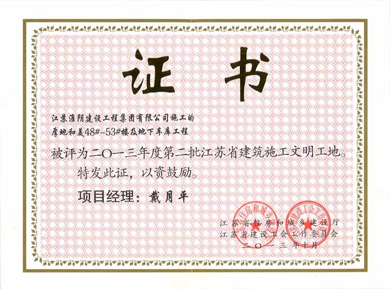 2013年度江苏省建筑施工文明工地-厚地和美-戴月平